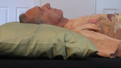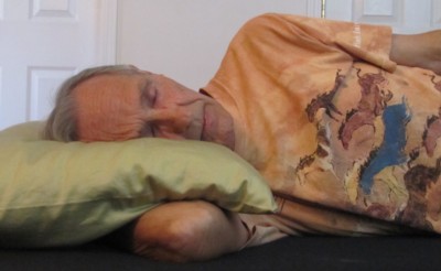 Lying on the side, people usually like to have more under the head so the head stays in alignment with the spine. With both of us an arm under the pillow gives the added height necessary. Notice too how I’ve bunched up my pillow for a little added height. People with shoulder problems may not be able to put their arm under their head for support. In that case, a thicker pillow may be required.
